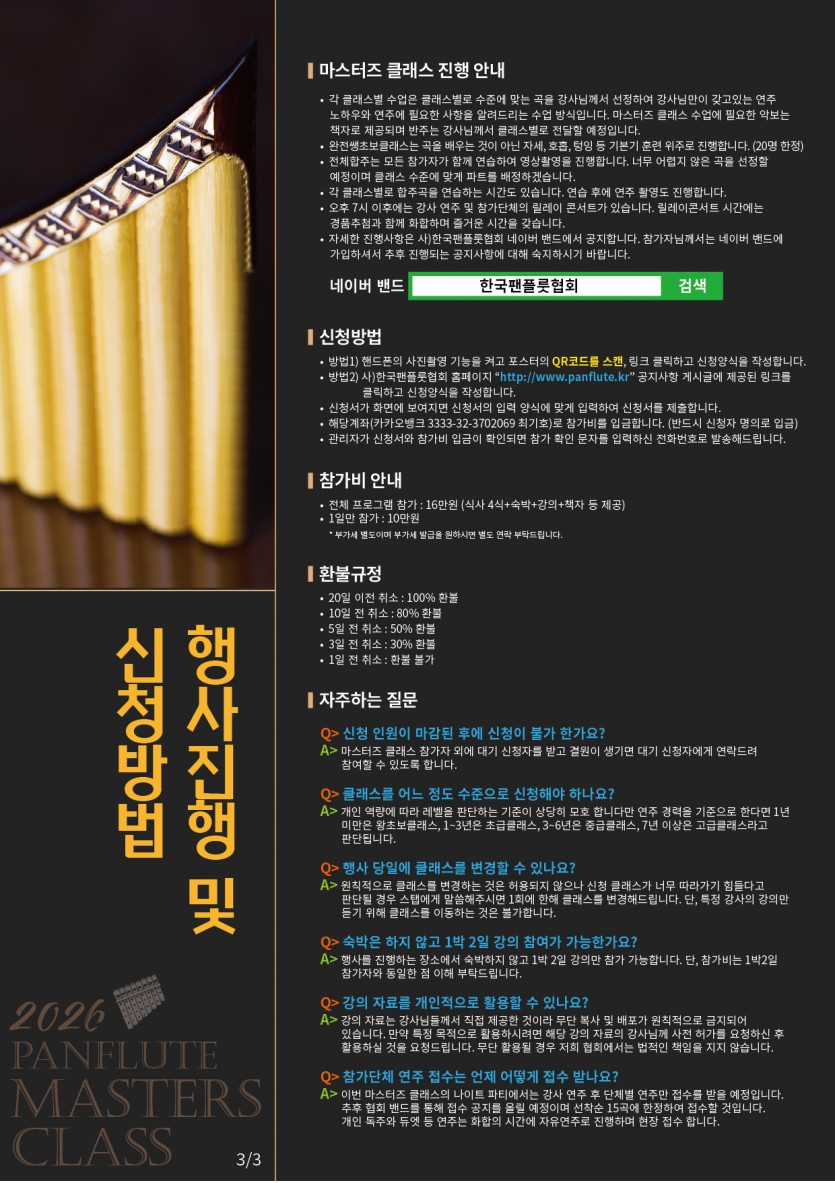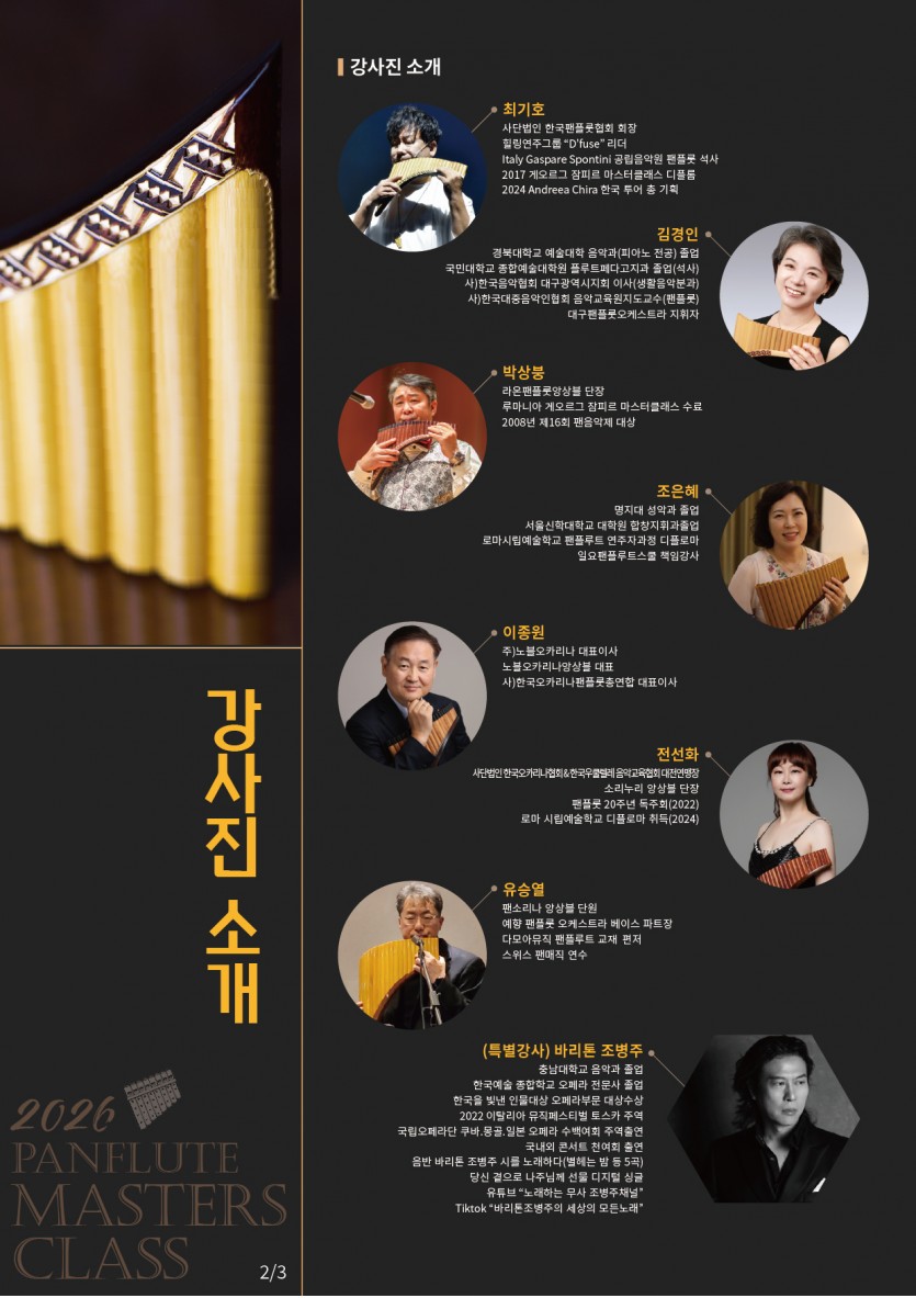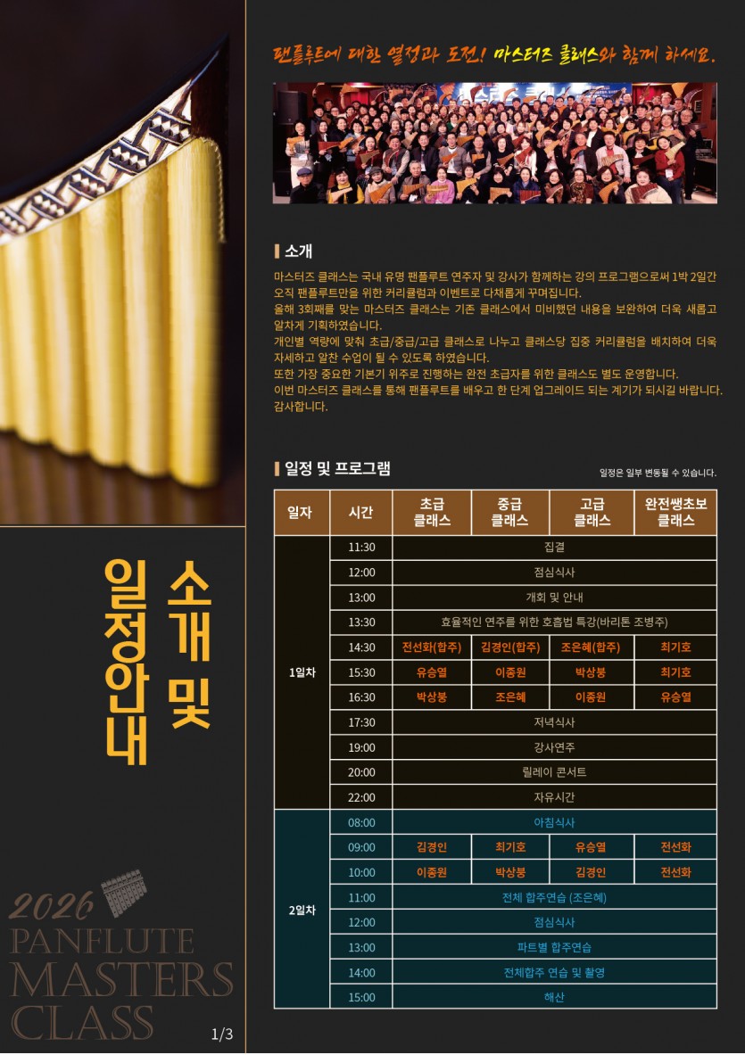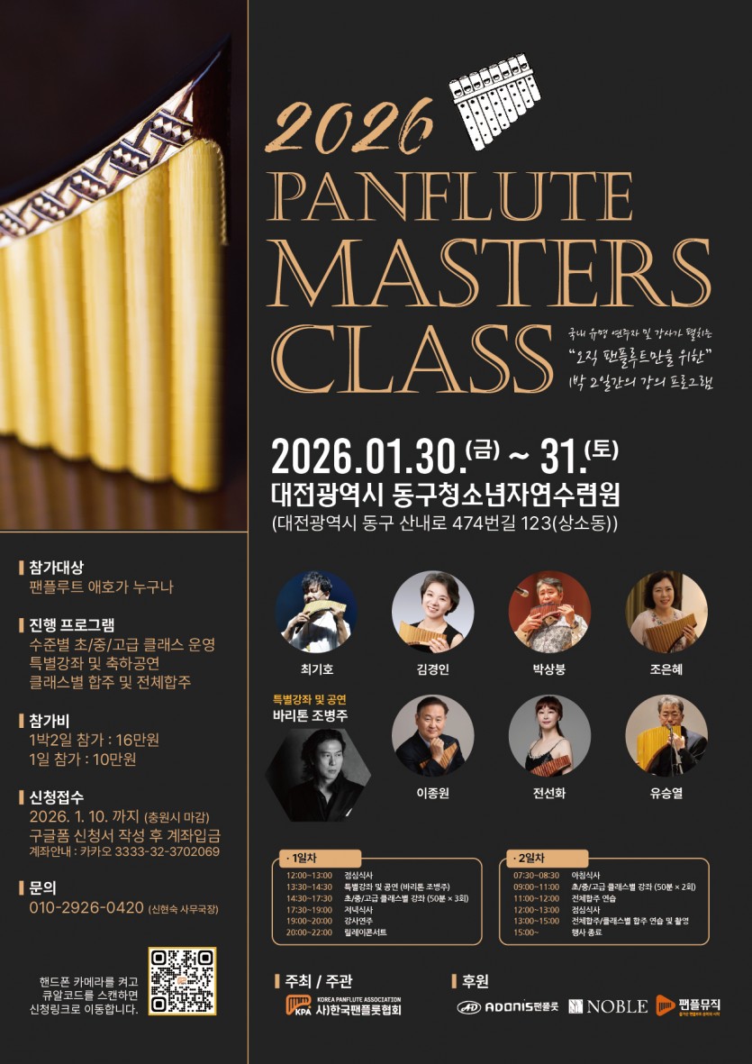 2026 팬플루트 마스터즈 클래스가 2026년 1월 30일(금)~31일(토) 대전 동구청소년자연학습원에서 개최됩니다.